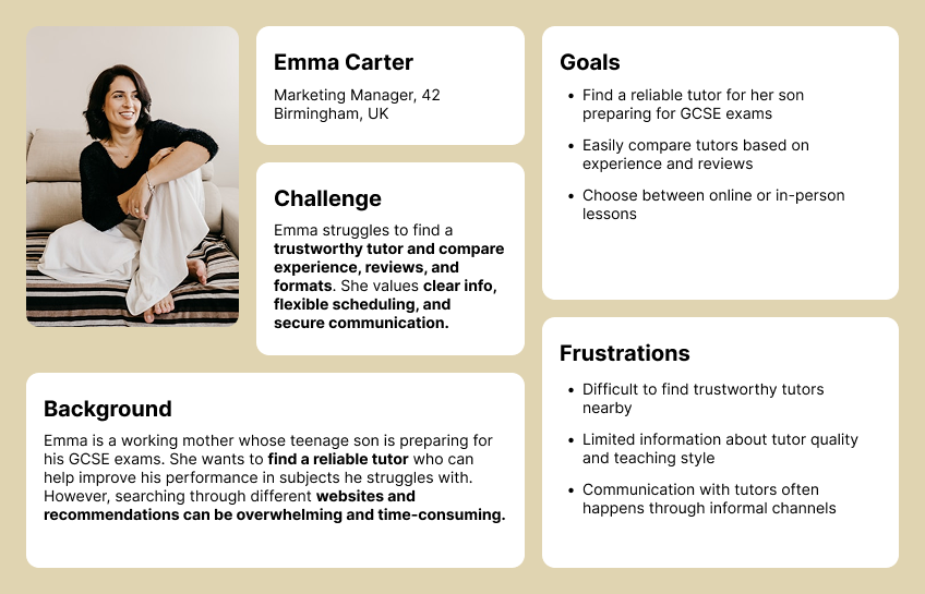 Their biggest challenge is identifying reliable tutors nearby while ensuring communication and lesson arrangements happen through a safe and organised platform.