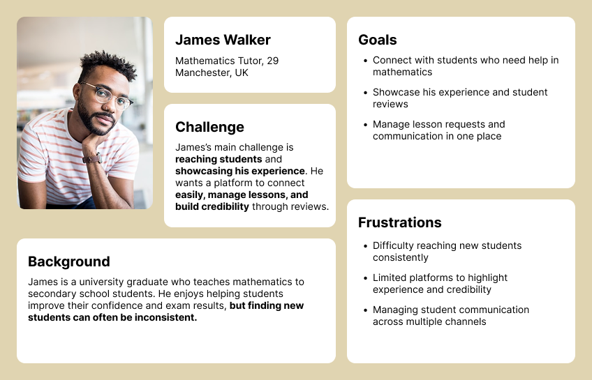 Their biggest challenge is reaching the right students while showcasing their experience, reviews, and availability in a clear and professional way.
