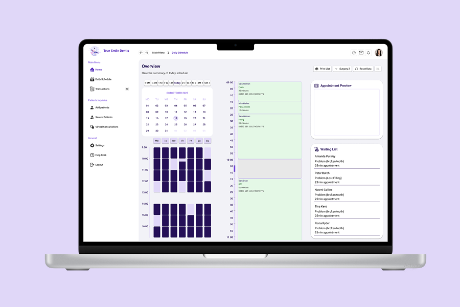 Throughout the process, it became clear that simplicity is essential in healthcare products. Patients want to book appointments quickly and understand their treatment without confusion, while staff need tools that help them manage schedules, payments, and patient records efficiently. Balancing these two needs shaped many of the design decisions.