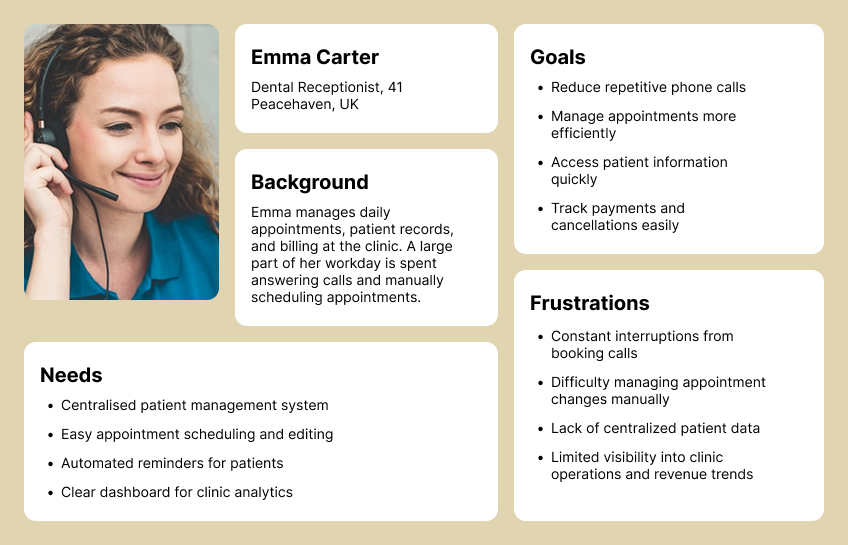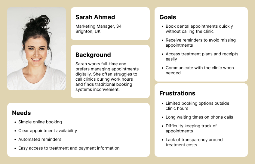 While both groups interact with the same system, their needs differ significantly. Patients prioritise speed, convenience, and clear communication when booking or managing appointments. In contrast, clinic staff focus on efficiency, organisation, and reducing the time spent on repetitive administrative tasks.