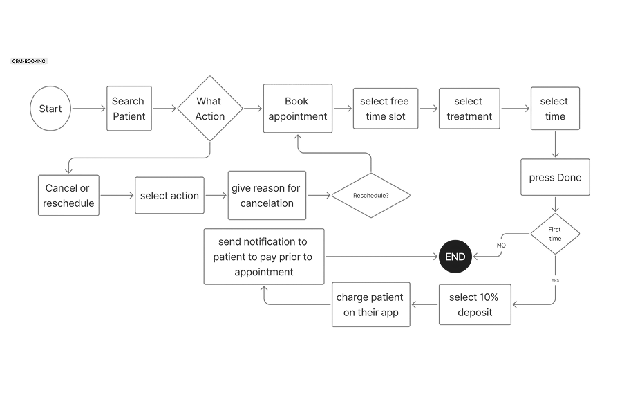 For clinic staff, the workflow focused on efficient appointment management and patient record access. Staff members can quickly search for patients, create or modify bookings, and manage communication through the CRM system. This reduces manual administrative work and centralises patient information in one place.