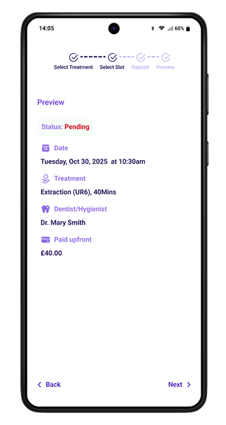 Several participants wanted to confirm their details before completing payment. A summary review screen was added so users can double-check the appointment type, date, and cost before finalising the booking.